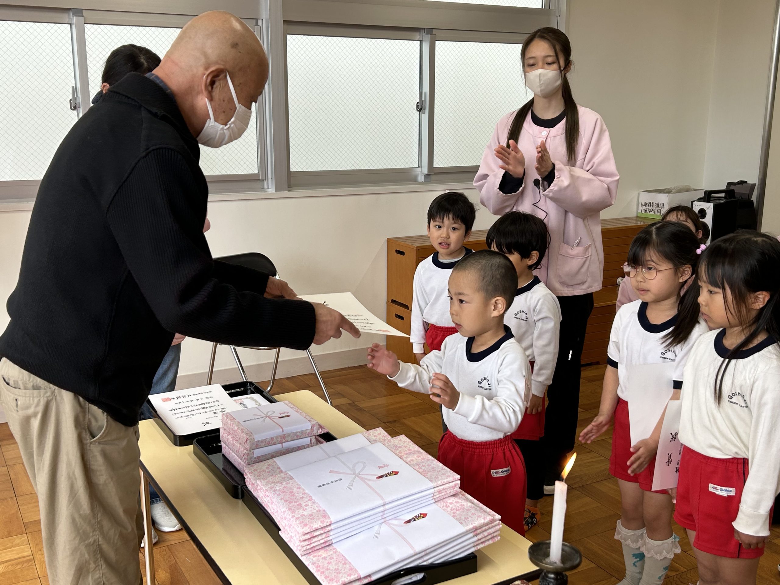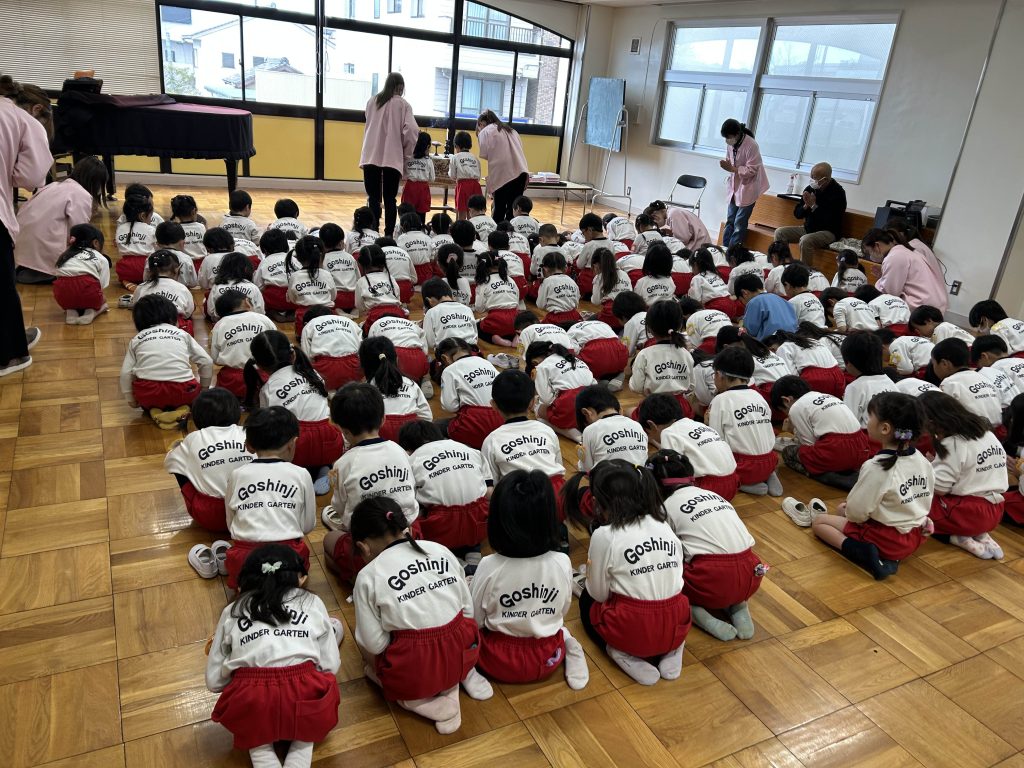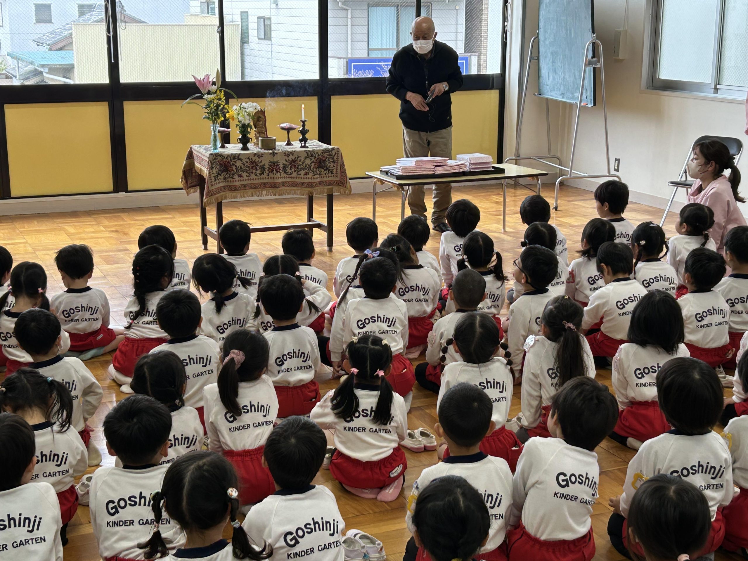 3月19日。今日は悟真寺幼稚園の終業式でした。園長先生からはきちんとありがとうございます、ごめんなさいが言える子が多くてとても嬉しいですとお話しがありました。この1年でみんな大きく成長したね。4月から希望の帽子の色がかぶれると良いね。