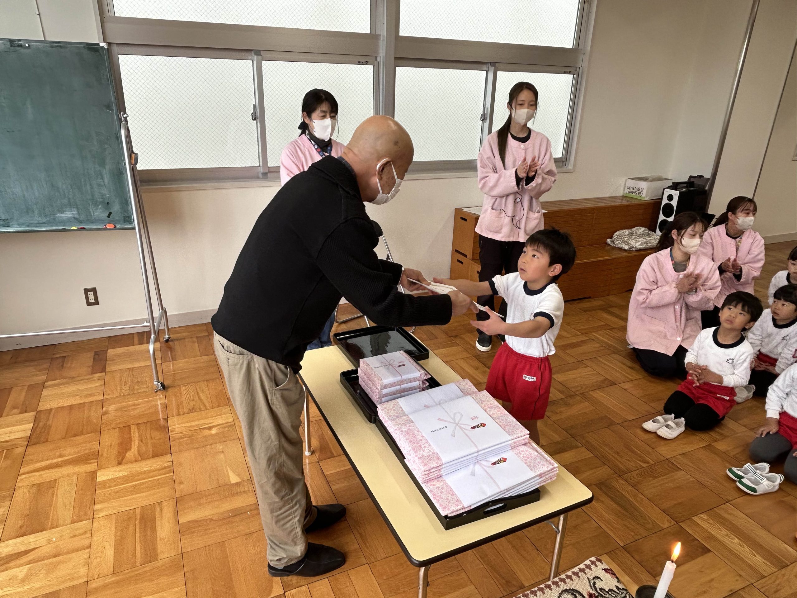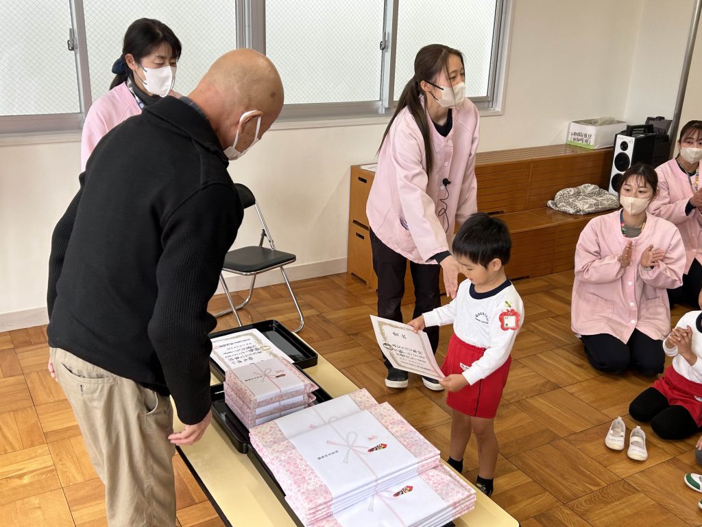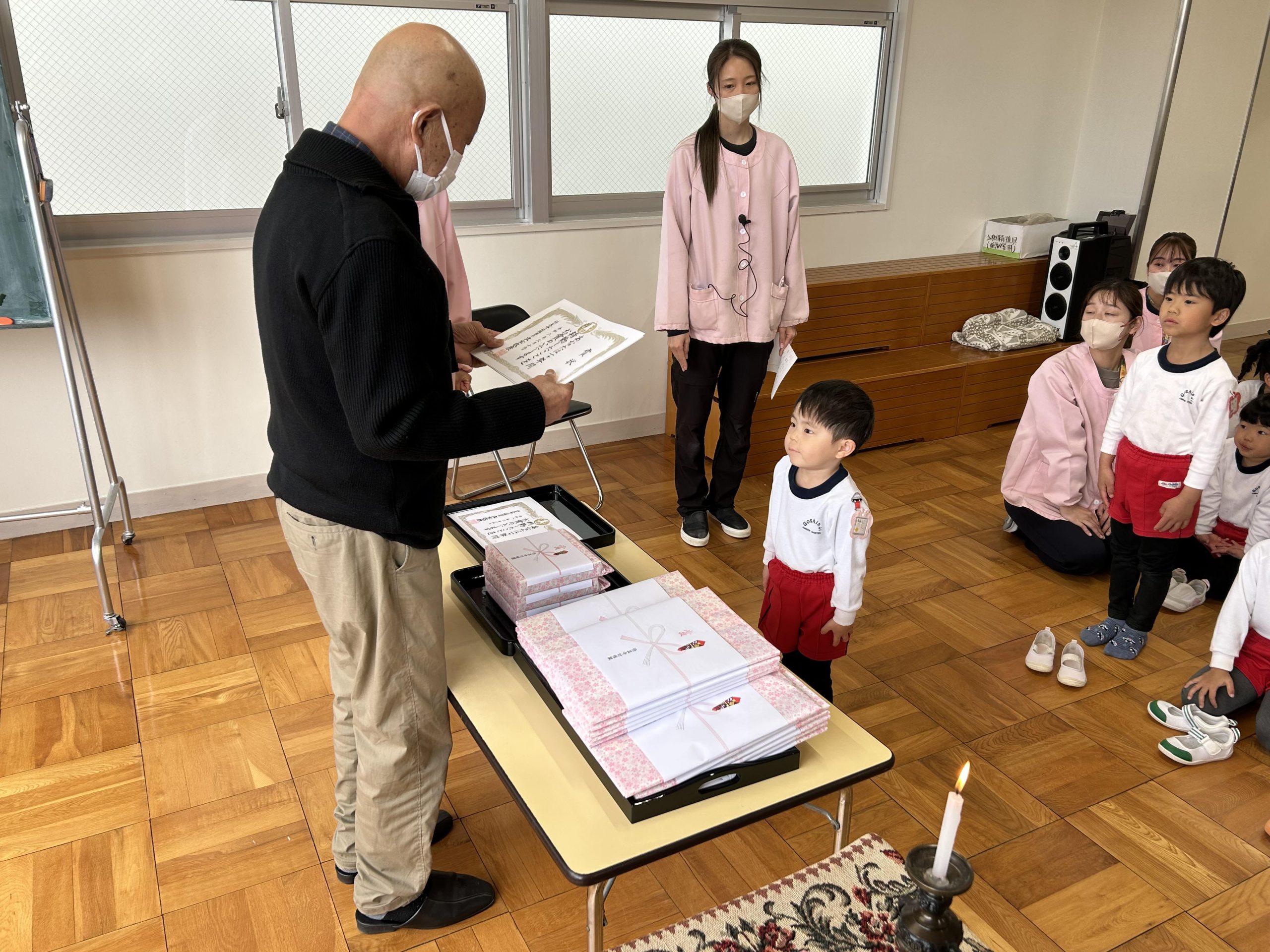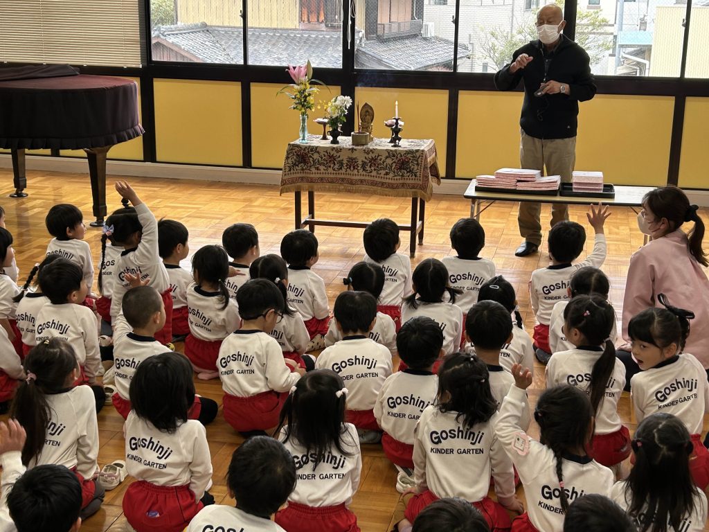 3月19日。今日は悟真寺幼稚園の終業式でした。園長先生からはきちんとありがとうございます、ごめんなさいが言える子が多くてとても嬉しいですとお話しがありました。この1年でみんな大きく成長したね。4月から希望の帽子の色がかぶれると良いね。
